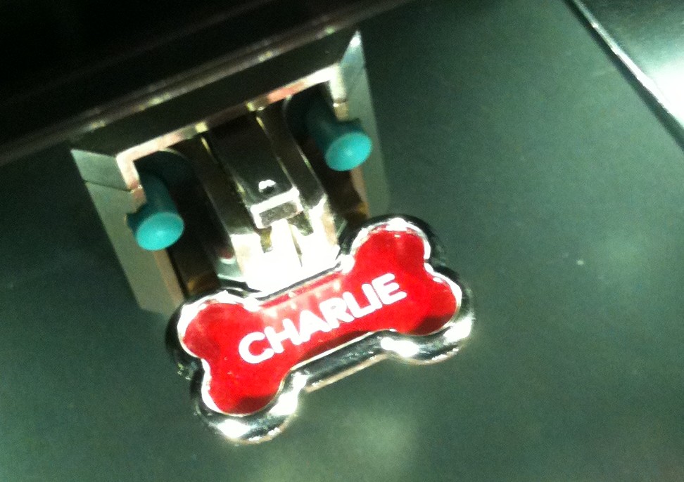 Now that Charlie has a name (thanks to everyone who suggested names and voted!) we had two tasks to accomplish. First, we had to teach it to him, and secondly, we had to get a cool name tag!