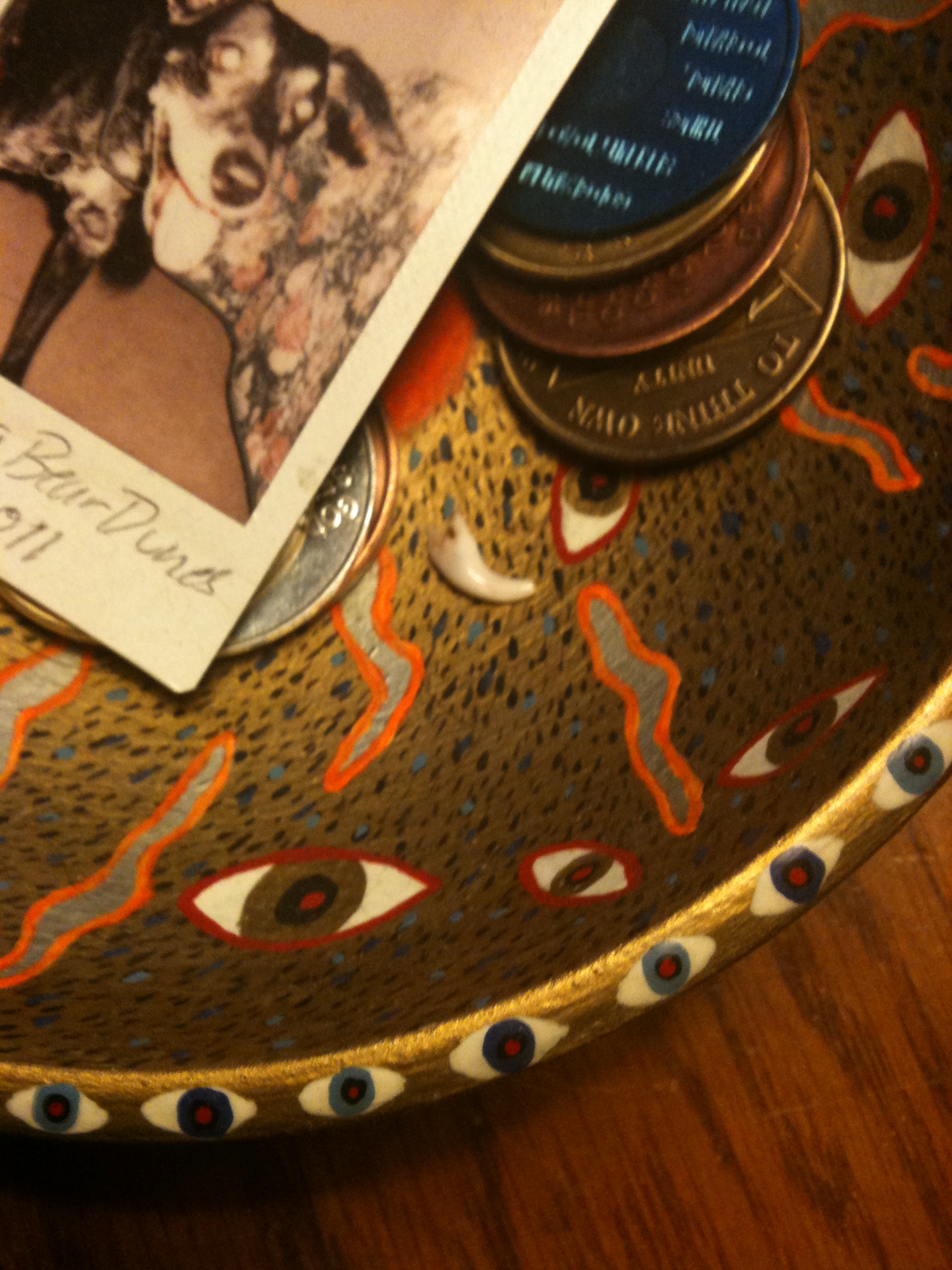 And last night, the Tooth Fairy came! Charlie lost one of his baby canine teeth. He got my attention by neurotically licking his nose (or so it appeared) and then it just flew out of his mouth. At first I thought one of his nails fell out, but upon closer examination I saw he lost a baby tooth. I put it in my magic bowl on top of the TV, and made sure to hide a dog treat in his bed.
