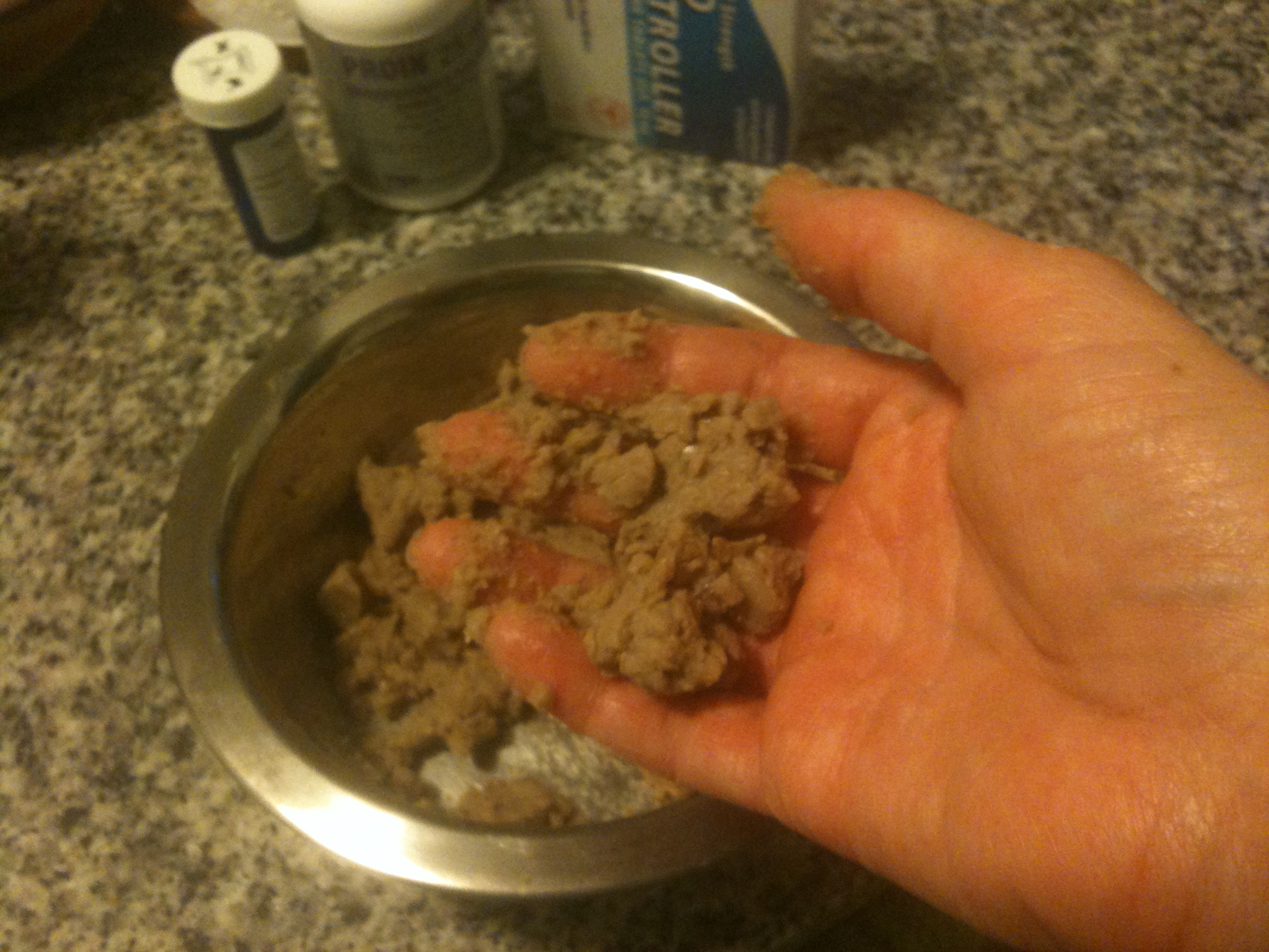 I was incredulous. But she loved this nasty food! Seriously!! I nudged her back to the bowl, and coaxed her to give it another go. She pushed past my hands. I had to find a way to get her to eat. On top of it all, I couldn’t administer her meds without food.