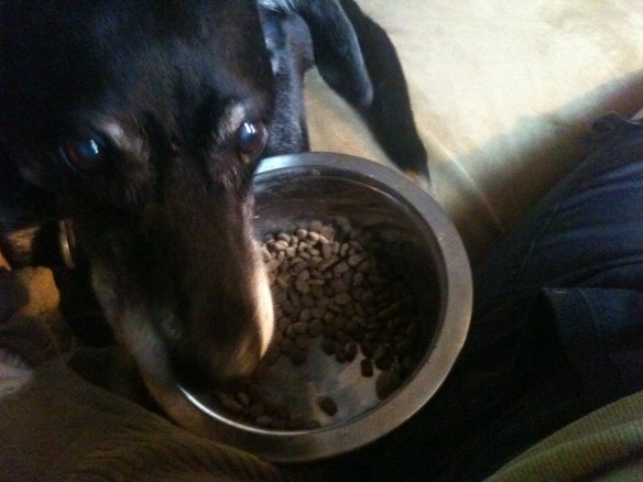 Usually Lex eats in the kitchen. She dives in for a couple minutes, then takes a break … disappearing through the dog door for a casual stroll through the yard’s bushes. I always watch through the kitchen window, to make sure she doesn’t vomit her meal, or stumble over a fallen branch. In the last couple weeks, Lexie has become somewhat frail, and her balance has deteriorated. Once she’s walking, she seems to do well, but it’s the starting up and slowing down that seem to trip her up.