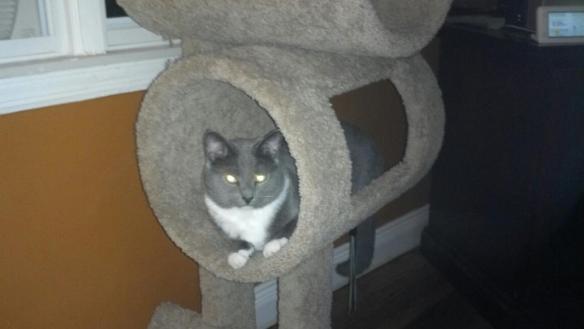 As we sat chatting in Cheryl’s front room, Charlie slowly inched toward the cat tree. Before we knew it, he was sniffing it out. Matt picked up the soft gray cat and put him on a perch.
