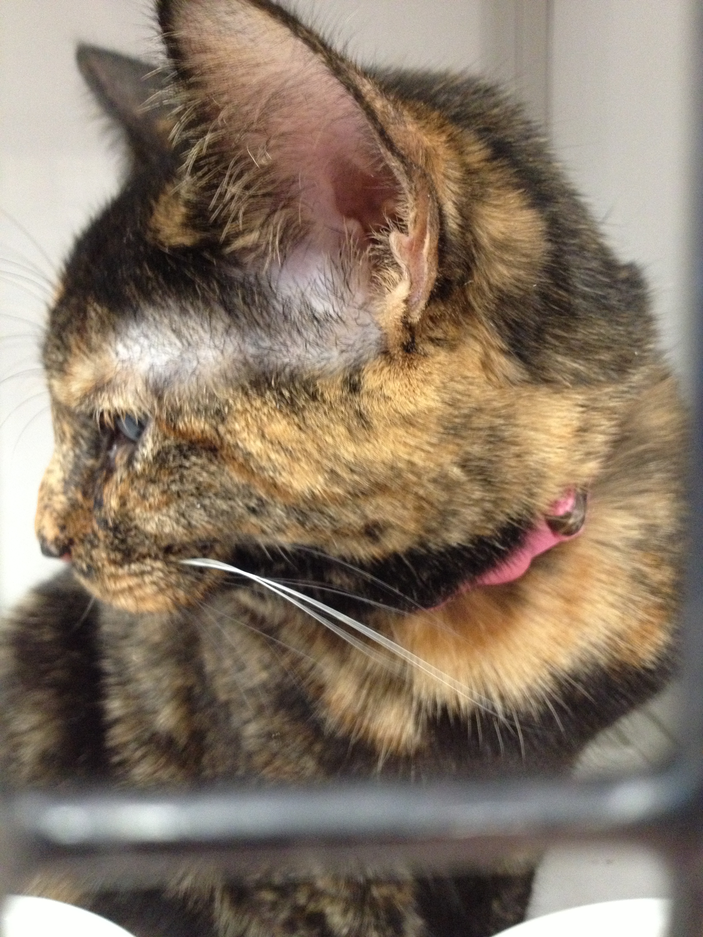 I wondered what this meant, so I Googled it. Apparently, tortie cats are known to be especially verbal, through meows, purrs and hisses. I looked at Lola in that cage. I couldn’t elicit any sort of sound from her. I was curious about what her meow sounds like.