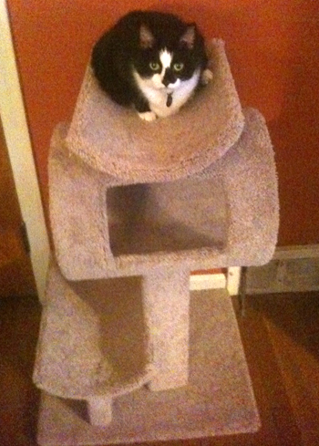 In preparation of bringing another dog into the house, Matt and I decided to buy a cat tree. A cat condo, if you will. A simple wood structure covered in carpet, providing perches and hiding spots.