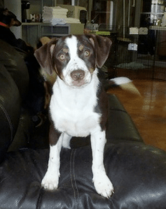 I scooched in close so we could read the dog’s profile together. She had an unfortunate name, but her profile seemed to make up for that. It said she was “house trained, great with kids, cats and other dogs. Zero food aggression and very well mannered.” The organization advised against using a crate with her. Lexie was the same way when I brought her home; she hated to be confined. This new pup was a border collie/spaniel mix, although it almost looked like the mix more likely involved a corgi. Kinda goofy looking, but we liked that.